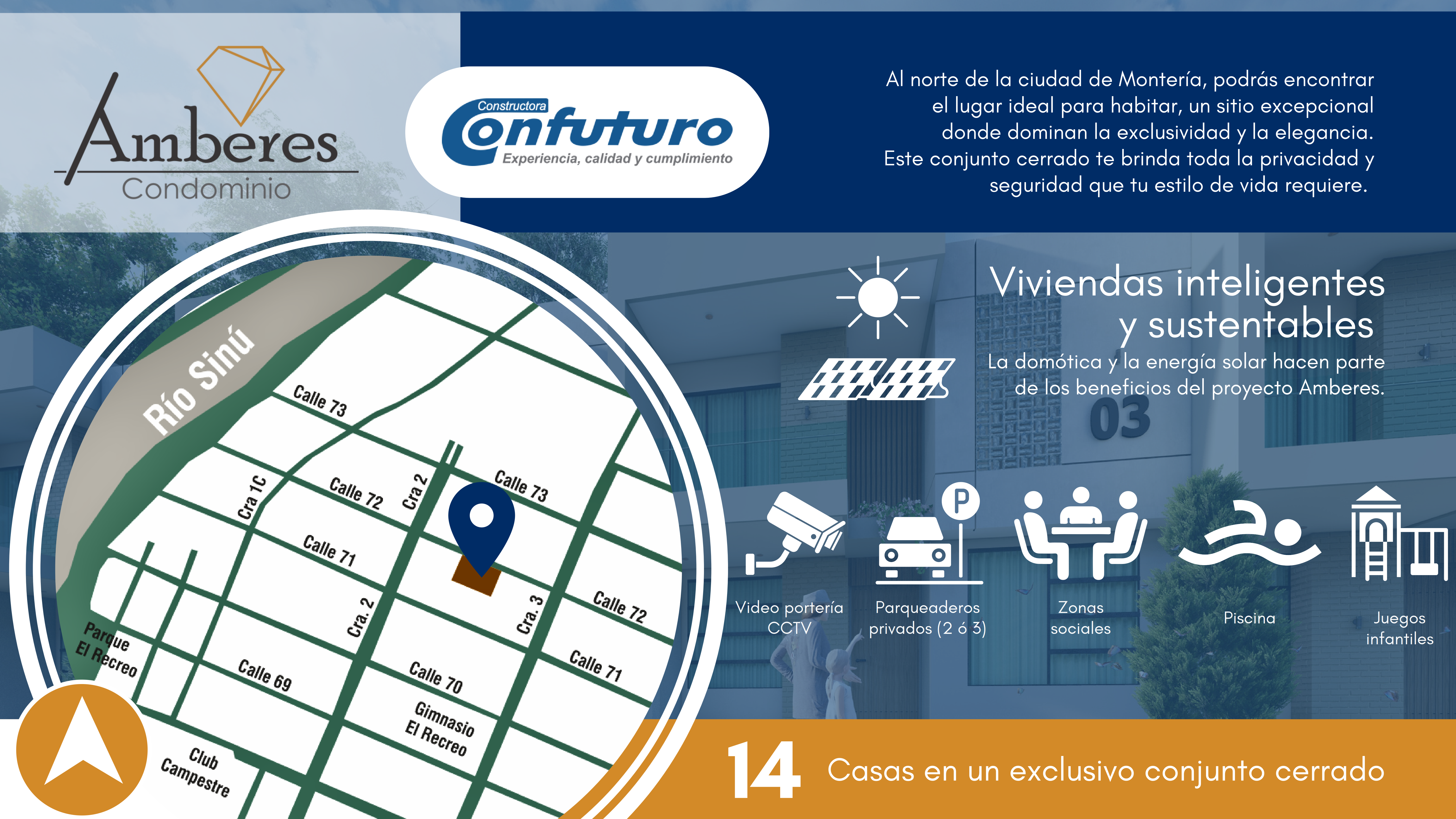 Está conformado por un conjunto cerrado de 14 viviendas en un conjunto residencial, donde se emplean páneles solares para hacer uso de energías renovables, el vídeo portero y el CCTV harán parte de la recepción, contará con piscina, parque infantil y zonas verdes internas para el esparcimiento.