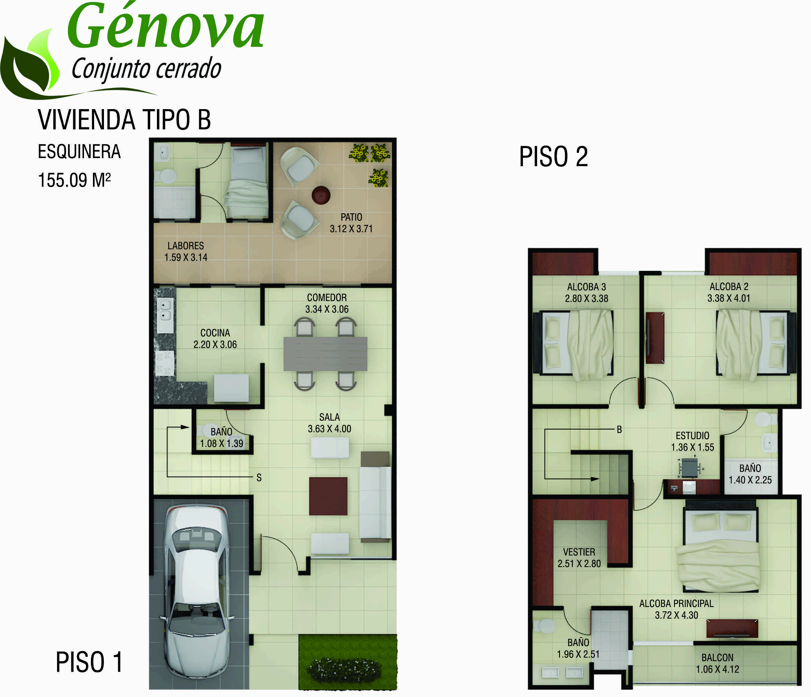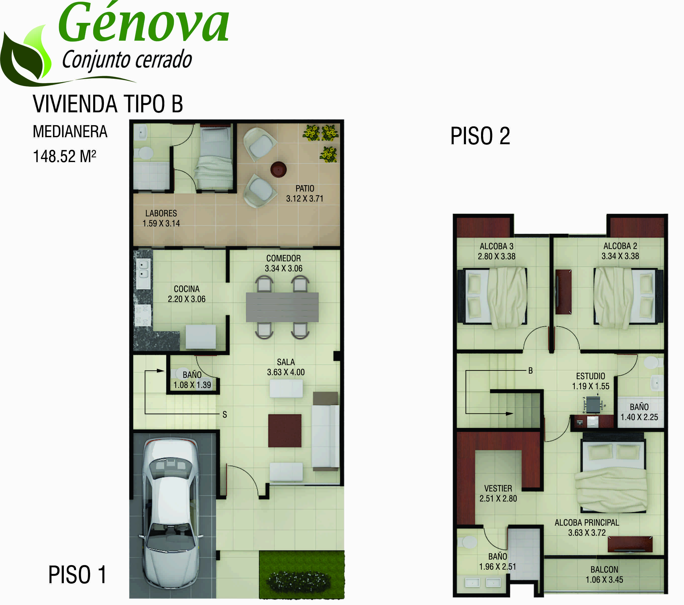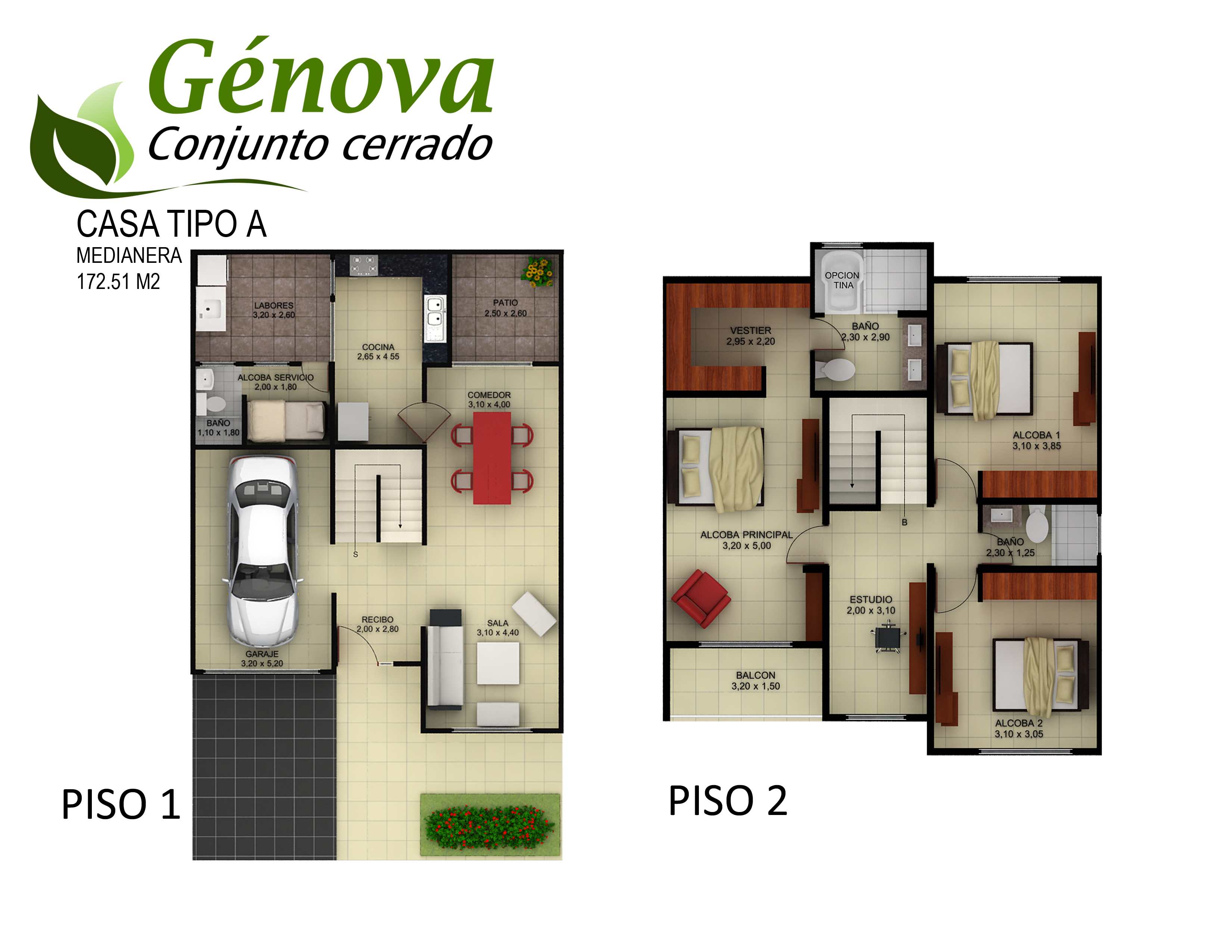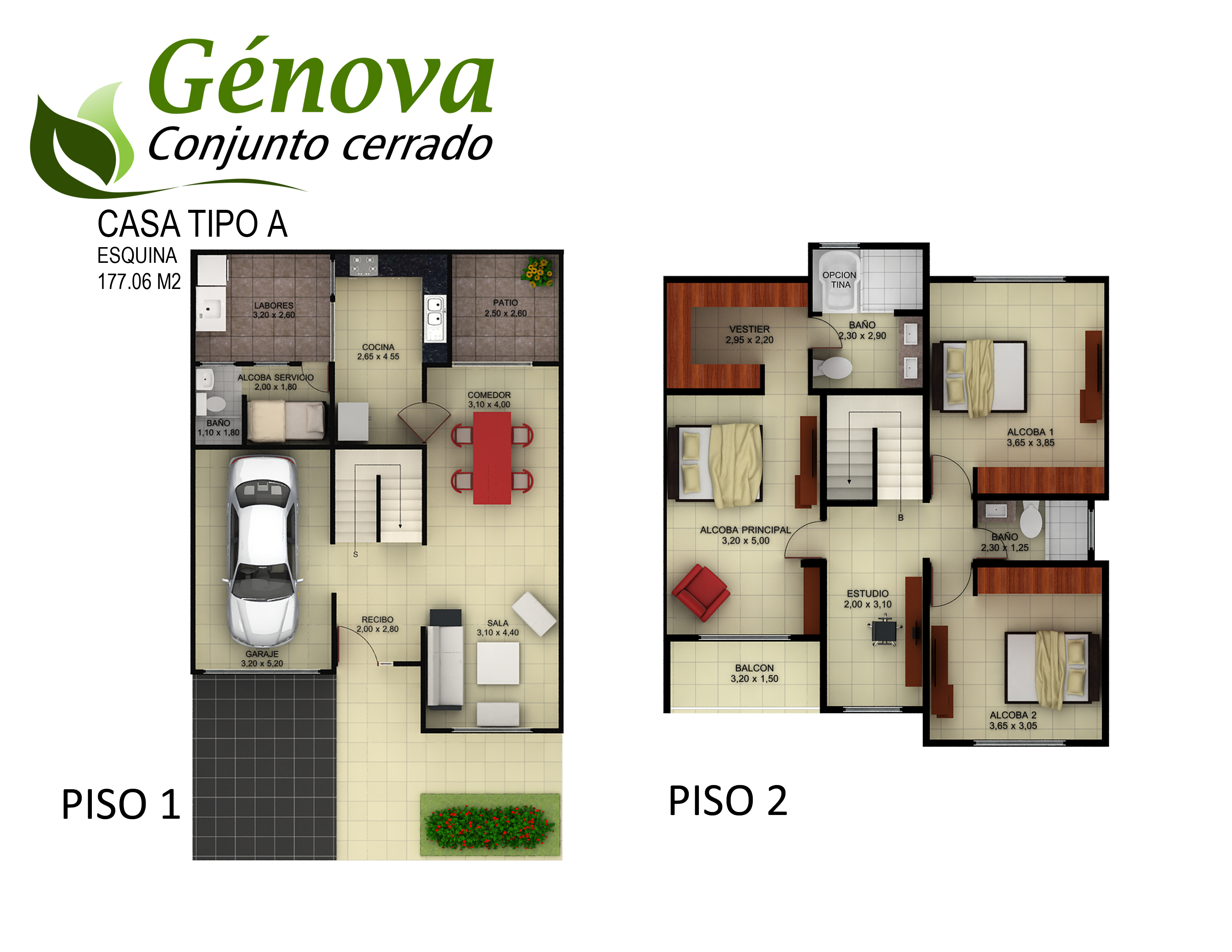 Casas de tres alcobas, tres baños, alcoba y baño de servicio opcional, sala-comedor, cocina, zona de labores y balcón en habitación principal. Con áreas desde  149.00 m² hasta 178.00 m².